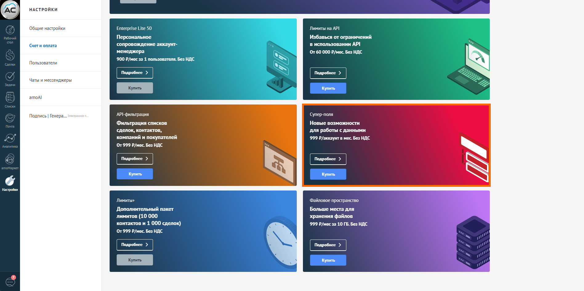 1️⃣ Войдите Настройка/Счет и оплата и в плашке Супер-поля кликните Купить