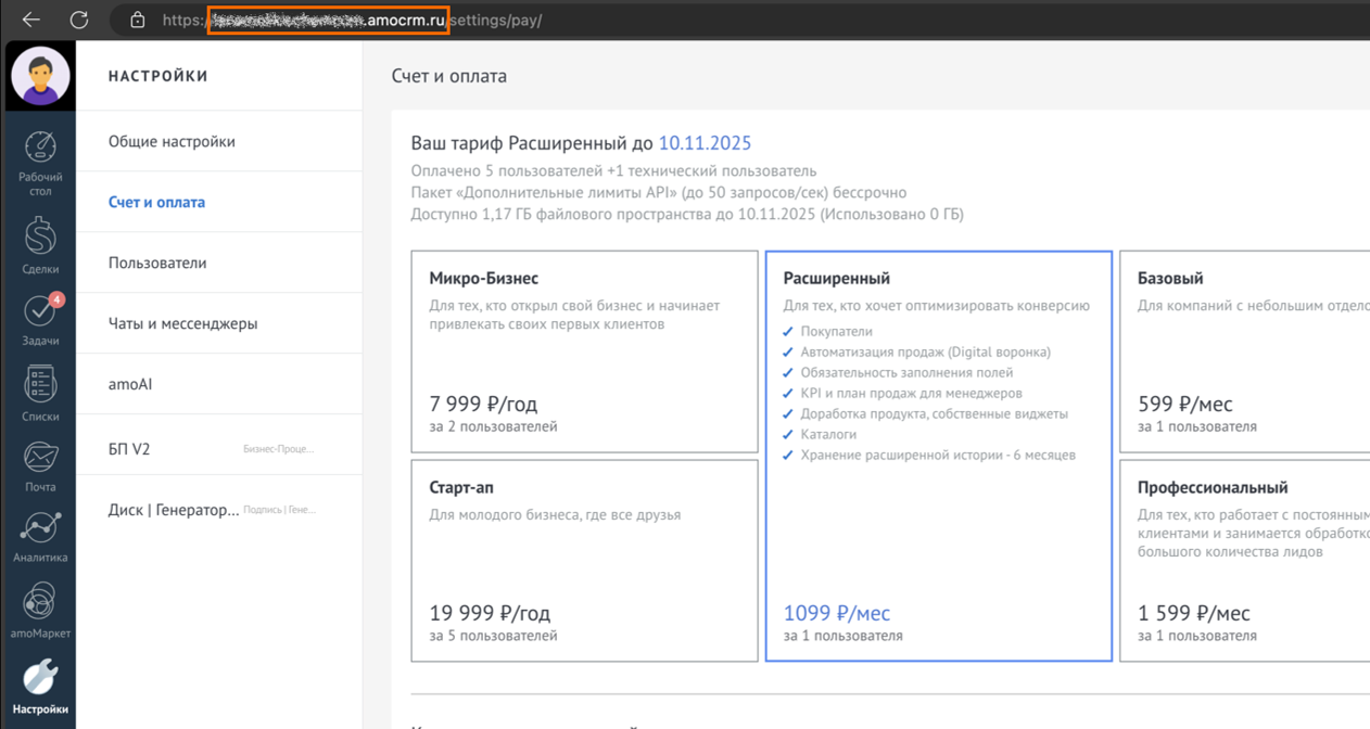 8️⃣ Откройте в другой вкладке браузера свой amoCRM и скопируйте без https доменное имя аккаунта