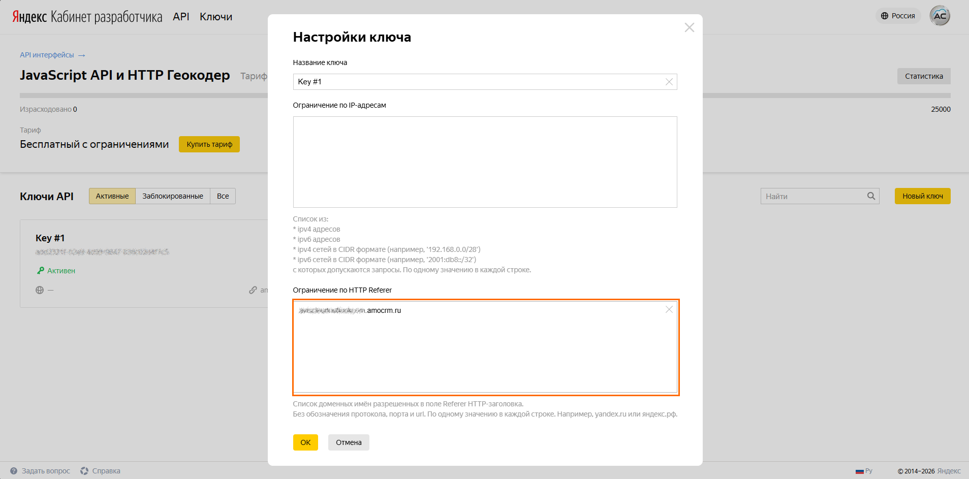 🔟 Вставьте в нижнее поле скопированное доменное имя аккаунта и кликните ОК, после этого скопируйте готовый ключ API