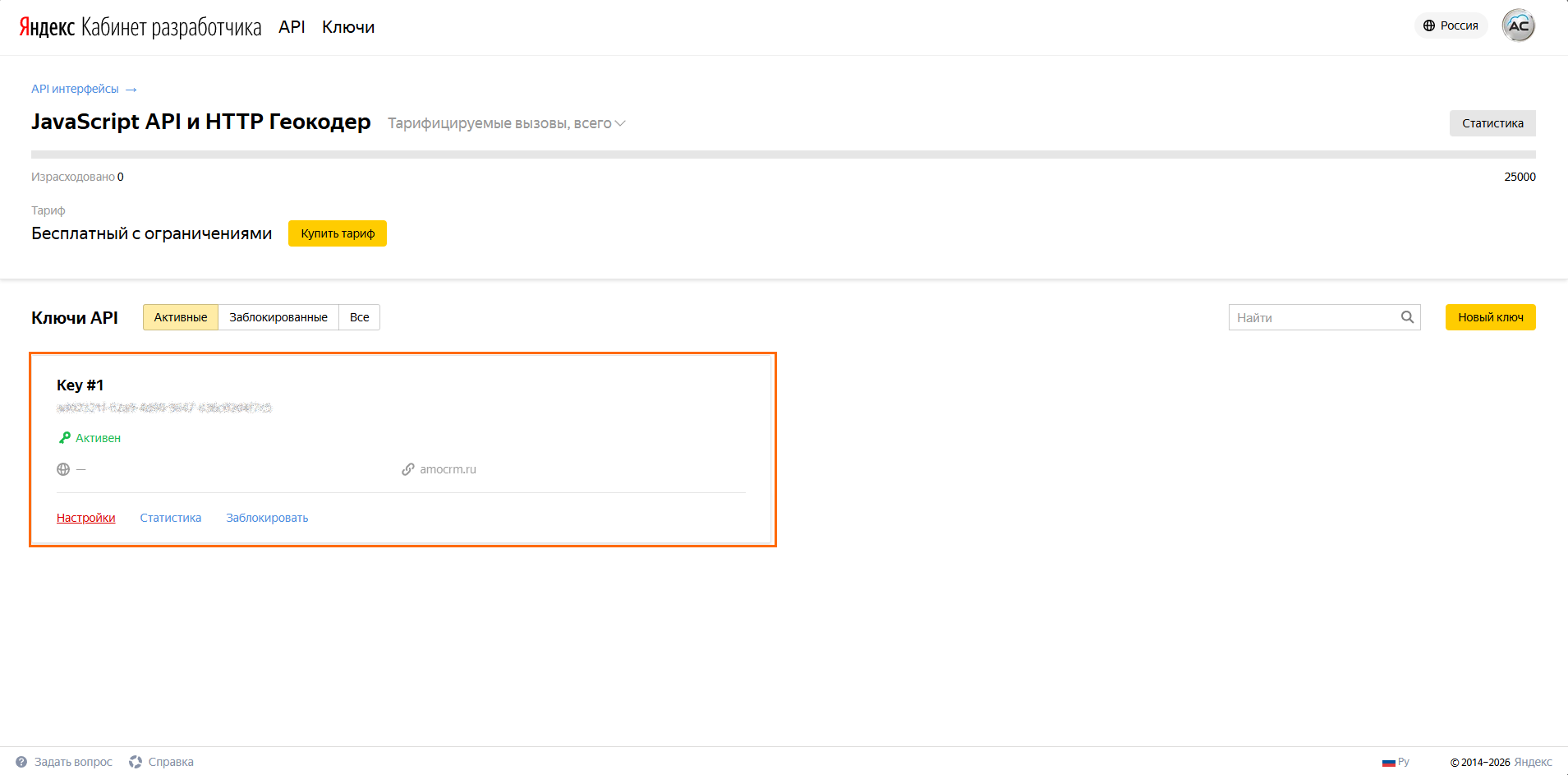 9️⃣ Вернитесь в кабинет разработчика, наведите курсор на плашку ключа и в открывшемся нижнем меню кликните Настройки