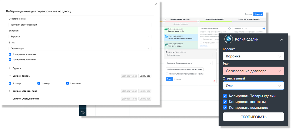 С помощью триггера или вручную виджет создаёт новую сделку и копирует в неё выбранные данные: